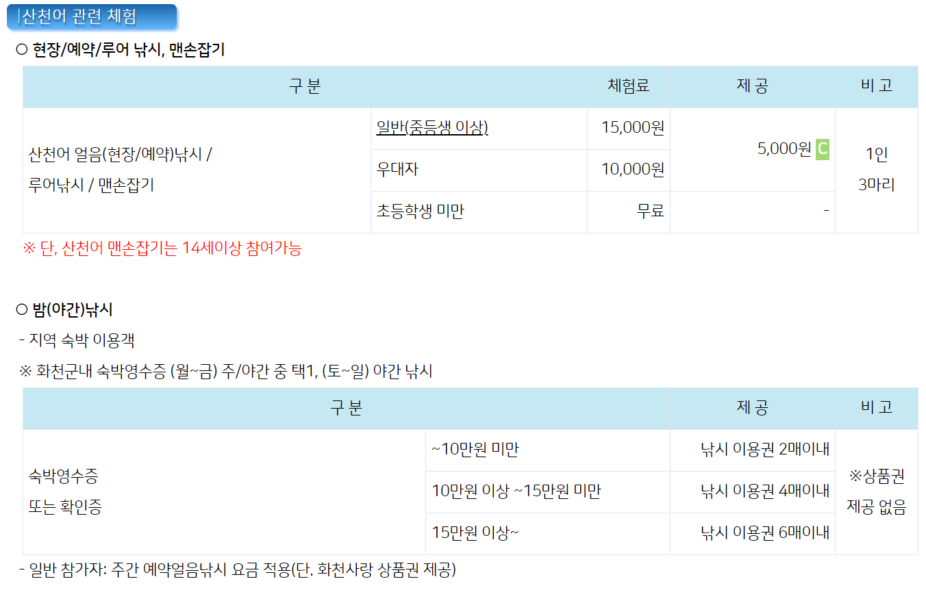 핵심 꿀팁! [숙박 시 낚시 공짜] 화천군 내 숙박시설을 이용하면 이용 금액에 따라 평일 얼음낚시나 밤낚시가 무료입니다. 영수증을 꼭 챙기셔서 축제장 안내소에서 낚시권으로 교환하세요!